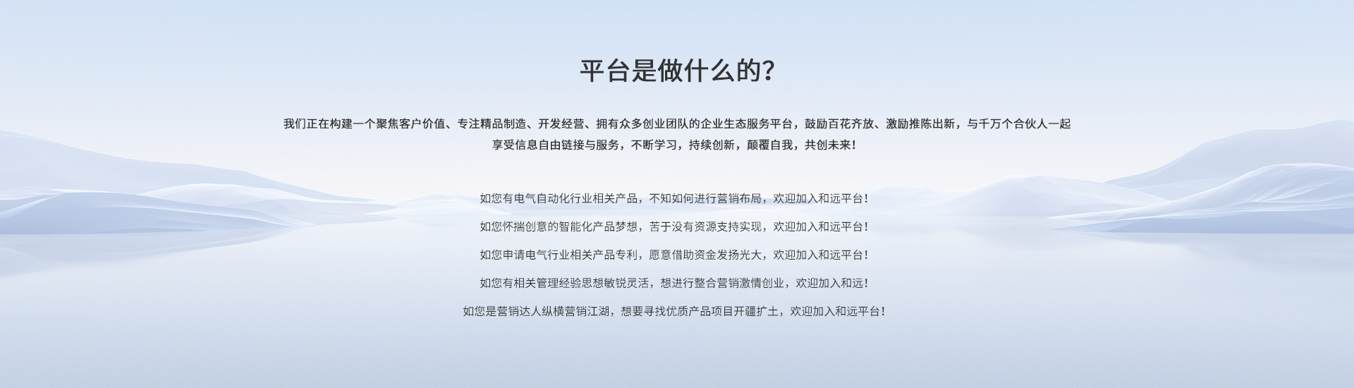 我們在配網、臺變、配電、用電及分布式發電、用電設備的全鏈條,全生命周期管理,含電力供電、用電、用能及發電和耗能設備的物聯網,智能化數據采集和傳輸的產品研發和生產,以電力為主專業,以智能化為專注研發目標,打造國內品牌,公司六大板塊,互通、互聯、互用